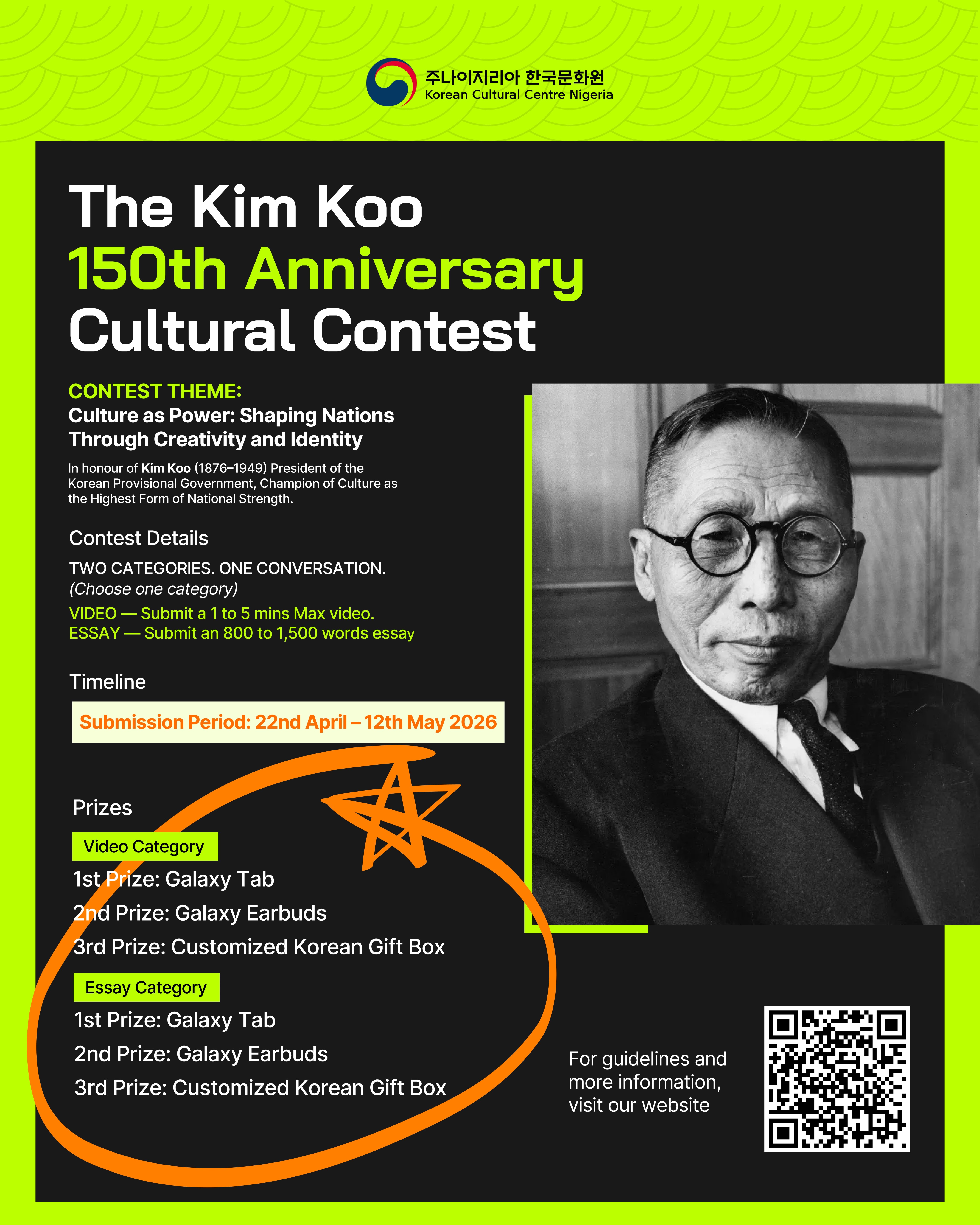 The Korean Cultural Centre Nigeria (KCCN) proudly announces the Kim Koo 150th Anniversary Cultural Contest, a multi-format creative competition in celebration of the 150th anniversary of the birth of Kim Koo (1876–1949), one of the most visionary leaders in Korea's independence movement. This contest is open exclusively to Nigerian nationals and residents.