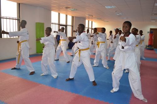 The students undertaking Taekwondo training under the watchful eyes of the Coach.