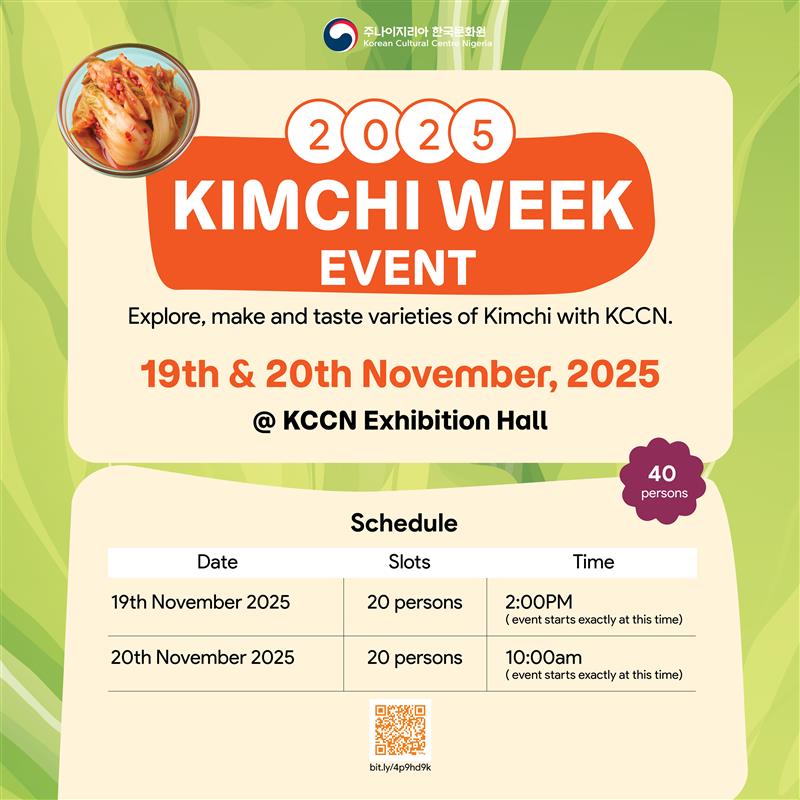 김치 위크 2025는 나이지리아의 한국 문화원에서 매년 한국의 가장 상징적인 요리인 김치를 기념하는 행사입니다. 올해 에디션은 김치의 맛, 창의성, 문화적 중요성을 강조하는 동시에 김치를 주제로 한 음식을 통해 한-나이지리아 문화 교류를 촉진합니다. #김치360