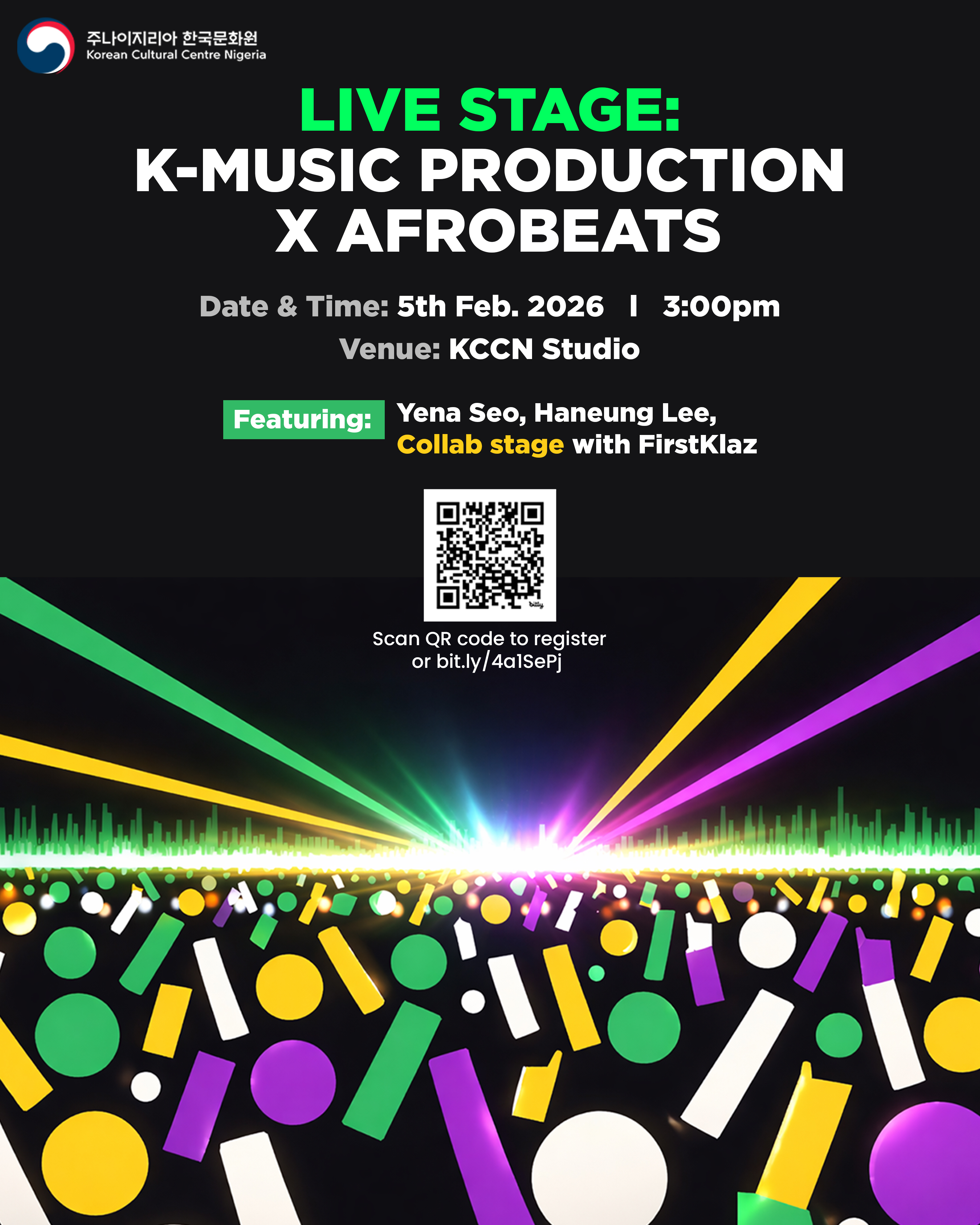 프로그램의 일환으로 나이지리아 아티스트 1명이 한국 아티스트와의 집중적인 협업 곡 제작 과정에 참여하기 위해 선정되어 Afrobeats-K-Music 퓨전 오리지널 트랙이 탄생했습니다. 또한 2월 2일에는 한국 진행자가 주도하는 음악 제작 인사이트, 예술 발전, 문화 간 산업 교류 등을 주제로 한 하루 동안 마스터클래스와 청취 세션에 참여할 나이지리아 아티스트 2명(비마 앤 아텔라)이 선정되었습니다.