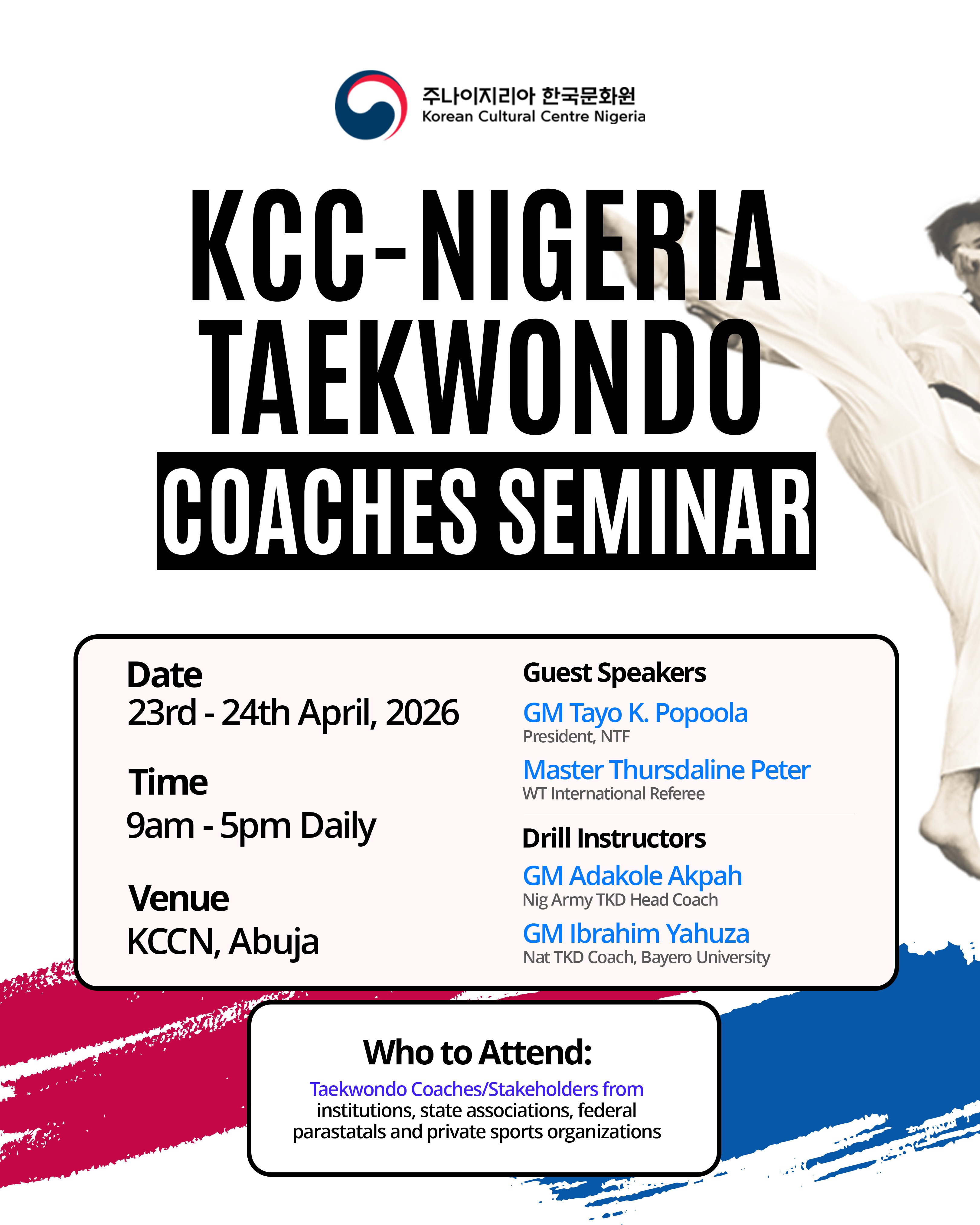 나이지리아 한국문화원(KCCN)은 나이지리아 전역의 태권도 지도 및 지도 수준을 향상시키기 위한 연례 프로그램인 KCC-나이지리아 태권도 코치 세미나 2026년판에 모든 나이지리아 태권도 코치와 강사를 공식 초청하게 되어 기쁘게 생각합니다.