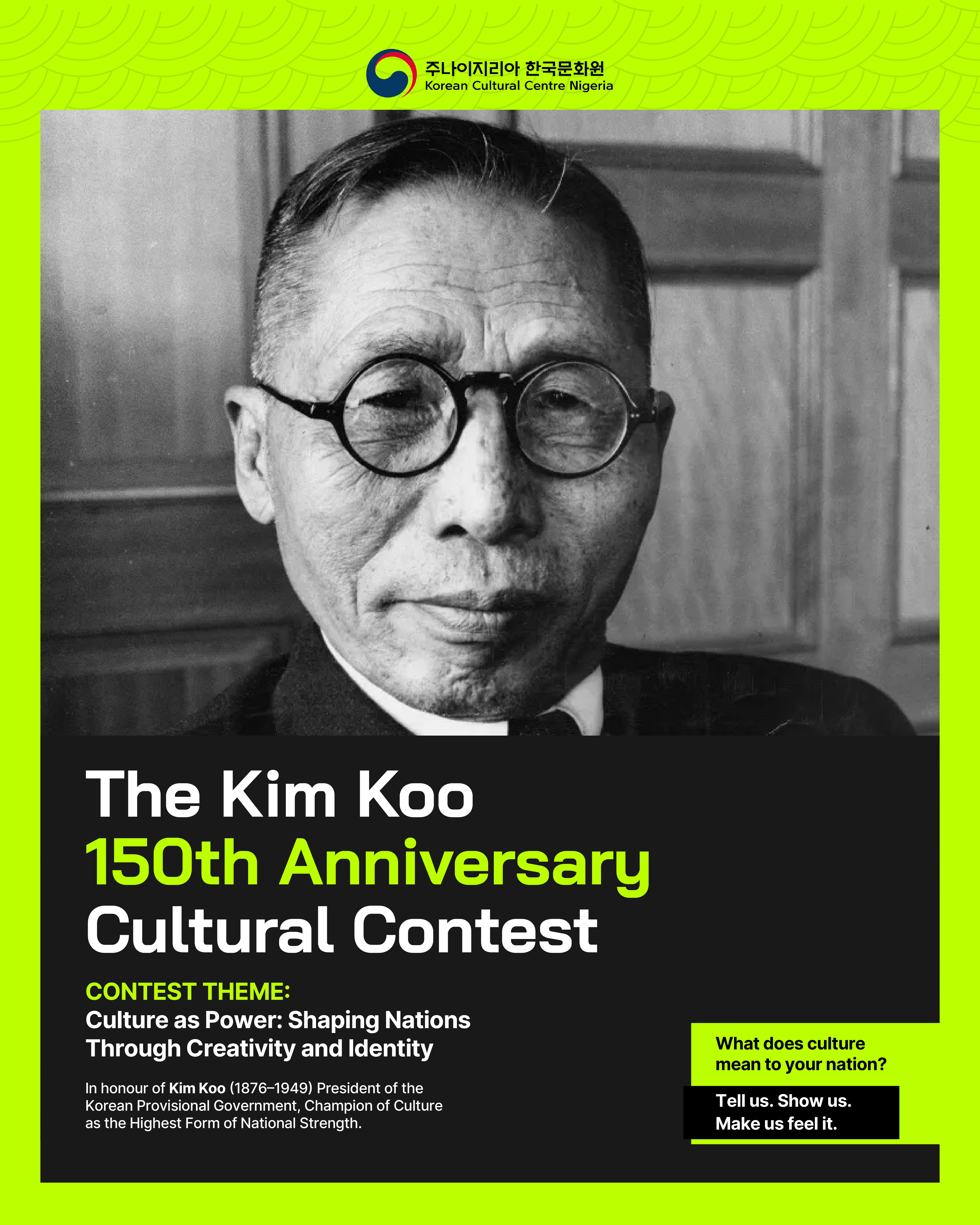 나이지리아 한국문화원(KCCN)은 한국 독립운동의 가장 비전 있는 지도자 중 한 명인 김구 선생(1876~1949) 탄생 150주년을 기념하는 다형식 창작 경연대회인 '김구 150주년 기념 문화경연대회'를 자랑스럽게 발표합니다. 이 대회는 나이지리아 국민과 주민들만 참가할 수 있습니다.